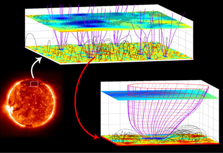 太陽極區(qū)冕洞區(qū)域的開放的漏斗狀磁場結(jié)構(gòu)(右下)。